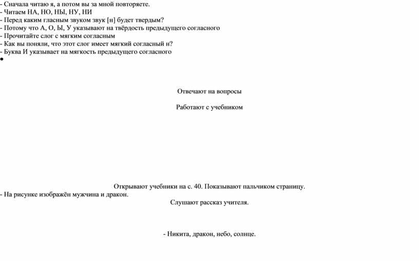 - А теперь мы с вами прочитаем слоги с буквой Н. - Сначала читаю я, а потом вы за мной повторяете. - Читаем НА, НО, НЫ, НУ, НИ - Перед каким гласным звуком звук [н] будет твердым? - Потому что А, О, Ы, У указывают на твёрдость предыдущего согласного - Прочитайте слог с мягким согласным - Как вы поняли, что этот слог имеет мягкий согласный н? - Буква И указывает на мягкость предыдущего согласного