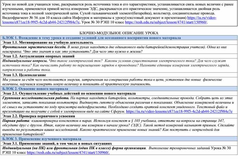 БЛОЧНО-МОДУЛЬНОЕ ОПИСАНИЕ УРОКА