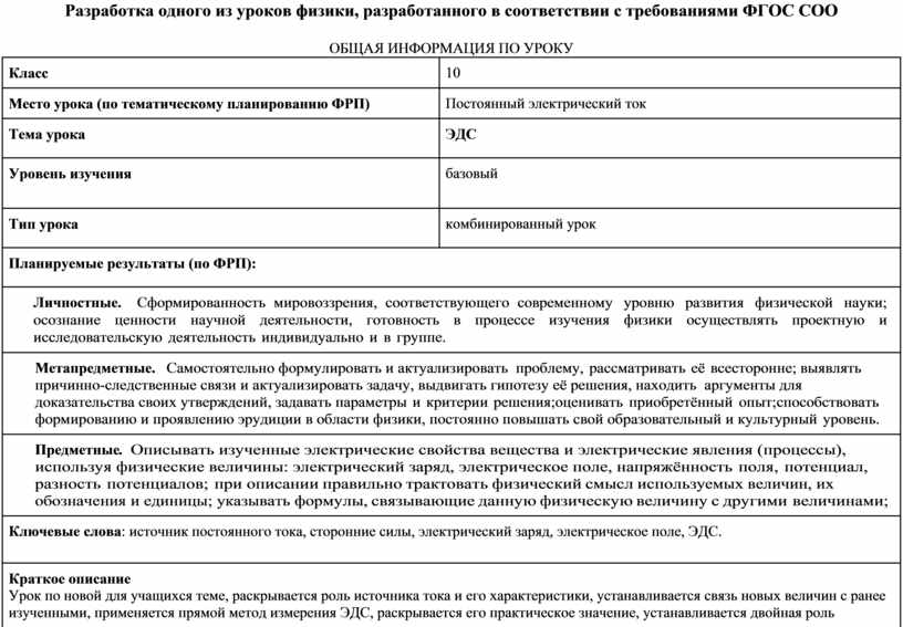 Разработка одного из уроков физики, разработанного в соответствии с требованиями ФГОС СОО