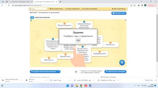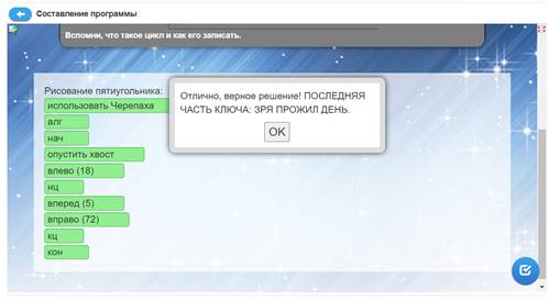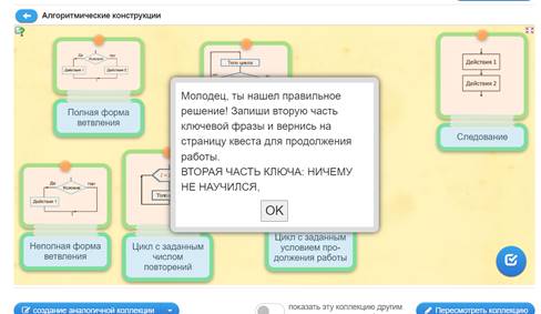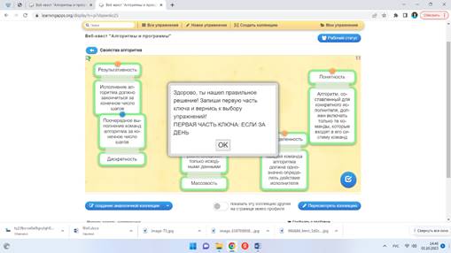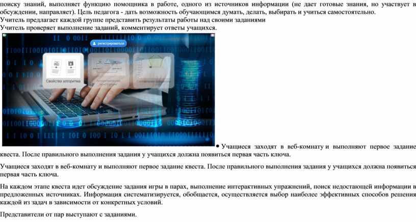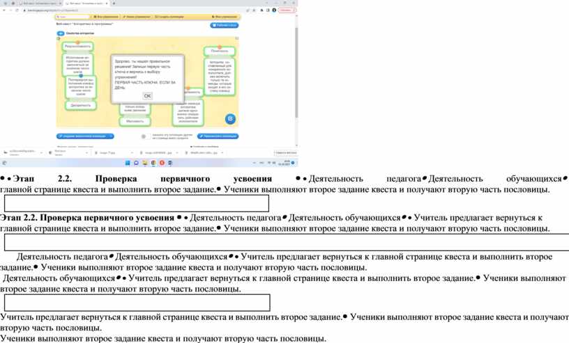 Учащиеся заходят в веб-комнату и выполняют первое задание квеста. После правильного выполнения задания у учащихся должна появиться первая часть ключа. На каждом этапе квеста идет обсуждение задания игры в парах, выполнение интерактивных упражнений, поиск недостающей информации в предложенных источниках. Информация систематизируется, обобщается, осуществляется выбор наиболее эффективных способов решения каждой из задач в зависимости от конкретных условий. Представители от пар выступают с заданиями.