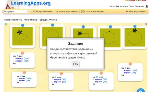 Ученики устанавливают соответствие между программой и рисунком, который получается при выполнении этой программы. Можно выполнить Это задание на компьютере по ссылке https://learningapps.org/display?v=pbn7outej25 |