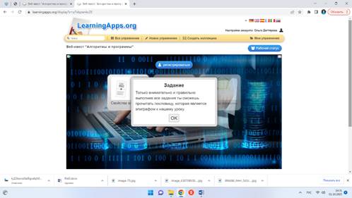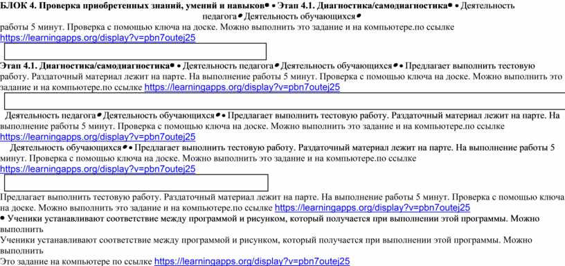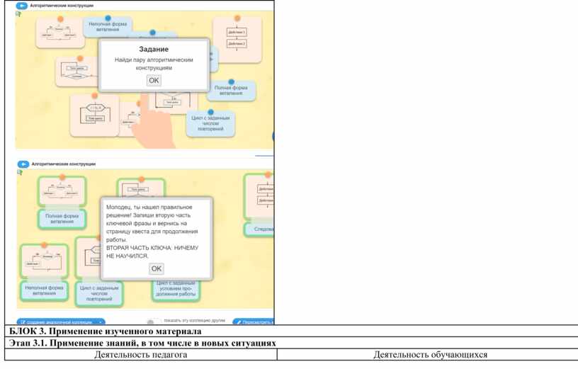 Учитель отправляет ссылку на квест каждой паре учащихся. https://learningapps.org/display?v=p7vbpwnkc25 Преподаватель побуждает обучающихся к самостоятельному поиску знаний, выполняет функцию помощника в работе, одного из источников информации (не дает готовые знания, но участвует в обсуждении, направляет). Цель педагога - дать возможность обучающимся думать, делать, выбирать и учиться самостоятельно. Учитель предлагает каждой группе представить результаты работы над своими заданиями Учитель проверяет выполнение заданий, комментирует ответы учащихся.