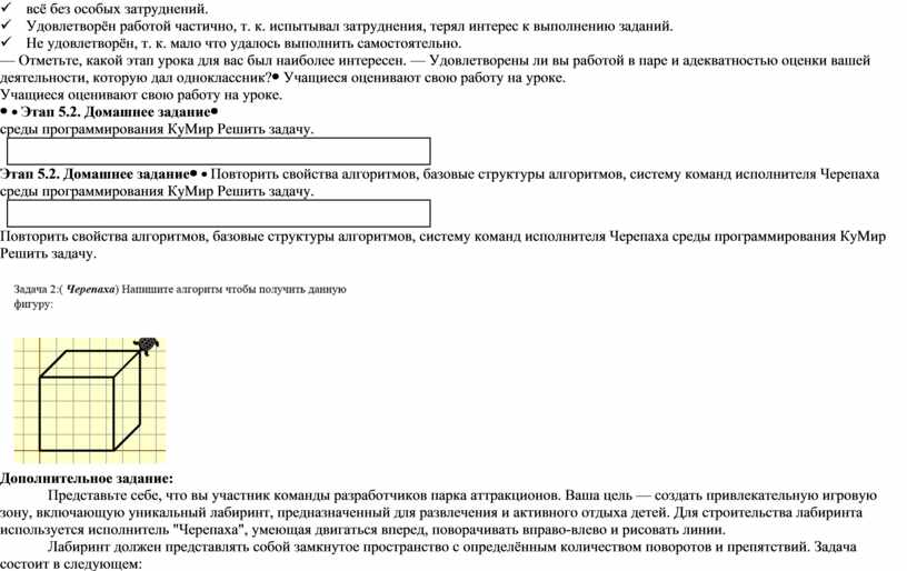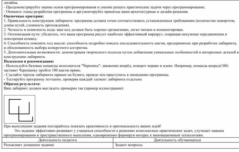 Дополнительное задание: Представьте себе, что вы участник команды разработчиков парка аттракционов. Ваша цель — создать привлекательную игровую зону, включающую уникальный лабиринт, предназначенный для развлечения и активного отдыха детей. Для строительства лабиринта используется исполнитель "Черепаха", умеющая двигаться вперед, поворачивать вправо-влево и рисовать линии. Лабиринт должен представлять собой замкнутое пространство с определённым количеством поворотов и препятствий. Задача состоит в следующем: - Написать программу для исполнителя "Черепаха", которая построит указанный лабиринт. - Проверить вашу программу с точки зрения длины траектории движения и соответствия заданным условиям. Что нужно сделать? - Составьте программу для исполнителя "Черепаха", которая создает сложный лабиринт с четкими границами и интересными элементами дизайна. - Продемонстрируйте знание основ программирования и умение решать практические задачи через программирование. - Опишите этапы разработки программы и аргументируйте принятые вами архитектурные и дизайн-решения. Оценочные критерии: 1. Правильность конструкции лабиринта: программа должна точно соответствовать установленным требованиям (количество поворотов, длина путей, сложность прохождения). 2. Четкость и понятность кода: ваш код должен быть хорошо организован, легко читаем и комментирован. 3. Оптимизация пути: убедитесь, что ваша программа рисует наиболее эффективный маршрут, сокращая ненужные передвижения и повторения команд. 4. Способность пояснить ход мысли: способность подробно описать последовательность шагов, предпринятых при разработке лабиринта, и обоснованность выбора конкретного алгоритма. 5. Дополнительные возможности: демонстрация творческого подхода путем добавления уникальных особенностей и интересных деталей в конструкцию лабиринта. Подсказки и рекомендации: - Используйте базовые команды исполнителя "Черепаха": движение вперёд, поворот вправо и влево. Например, команда вперед(100) заставит Черепашку пройти 100 шагов прямо. - Сделайте чертеж лабиринта заранее на бумаге, прежде чем приступить к написанию программы. - Тестируйте программу поэтапно, проверяя каждый элемент лабиринта отдельно. Образец результата: Ваш лабиринт должен выглядеть примерно так (пример иллюстрации):