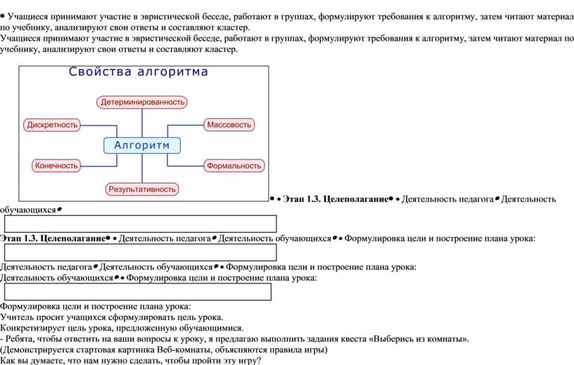 Учащиеся принимают участие в эвристической беседе, работают в группах, формулируют требования к алгоритму, затем читают материал по учебнику, анализируют свои ответы и составляют кластер.