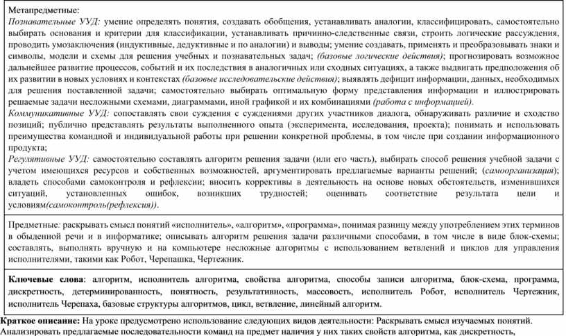 Предметные: раскрывать смысл понятий «исполнитель», «алгоритм», «программа», понимая разницу между употреблением этих терминов в обыденной речи и в информатике; описывать алгоритм решения задачи различными способами, в том числе в виде блок-схемы; составлять, выполнять вручную и на компьютере несложные алгоритмы с использованием ветвлений и циклов для управления исполнителями, такими как Робот, Черепашка, Чертежник. |
