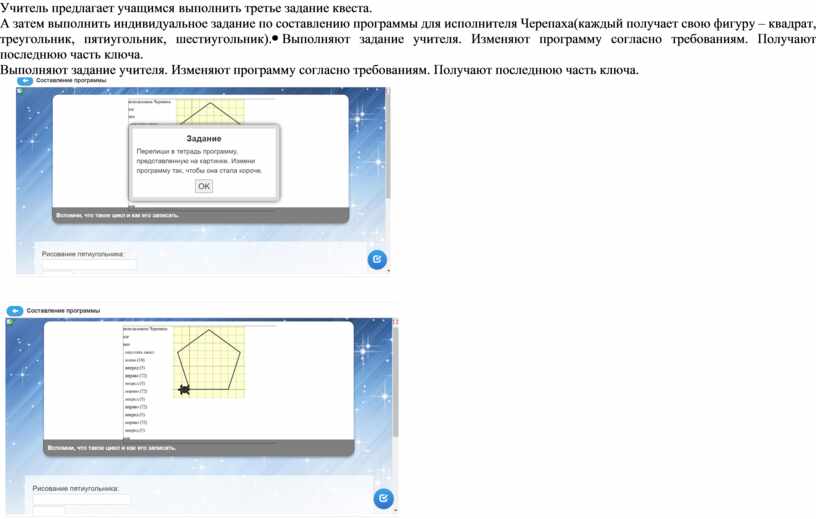 Учитель предлагает учащимся выполнить третье задание квеста. А затем выполнить индивидуальное задание по составлению программы для исполнителя Черепаха(каждый получает свою фигуру – квадрат, треугольник, пятиугольник, шестиугольник). |