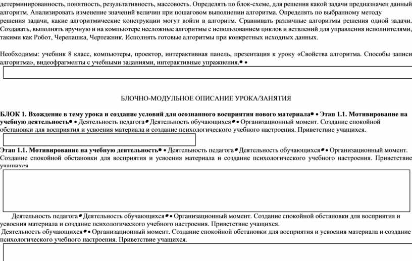 БЛОЧНО-МОДУЛЬНОЕ ОПИСАНИЕ УРОКА/ЗАНЯТИЯ