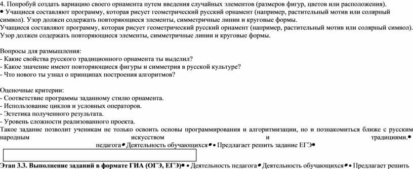 Оценочные критерии: - Соответствие программы заданному стилю орнамента. - Использование циклов и условных операторов. - Эстетика полученного результата. - Уровень сложности реализованного проекта. Такое задание позволит ученикам не только освоить основы программирования и алгоритмизации, но и познакомиться ближе с русским народным искусством и традициями. |