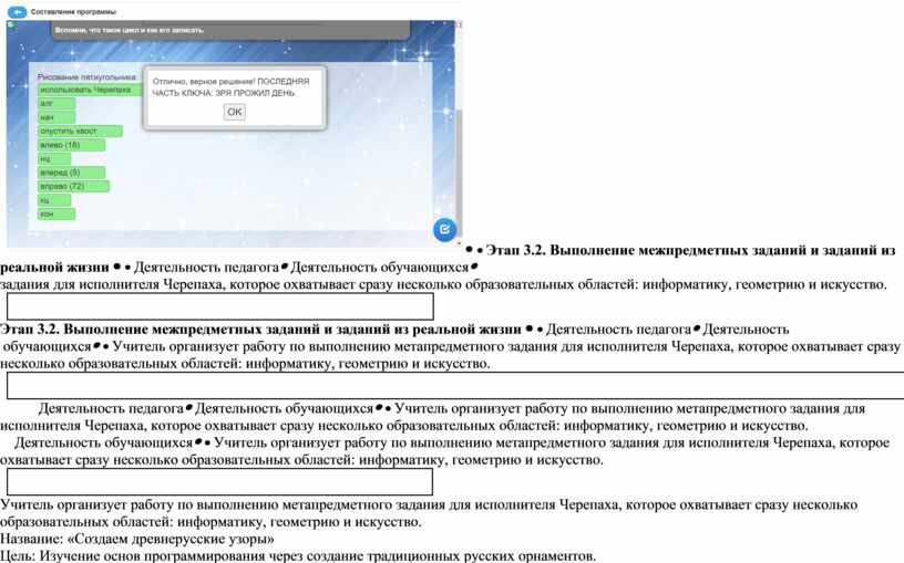 Учитель организует работу по выполнению метапредметного задания для исполнителя Черепаха, которое охватывает сразу несколько образовательных областей: информатику, геометрию и искусство. Название: «Создаем древнерусские узоры» Цель: Изучение основ программирования через создание традиционных русских орнаментов. Требования к выполнению: 1. Создай программу, в которой черепаха нарисует простой традиционный русский орнамент (можно выбрать простейший вариант: кружочки и волнистые линии). 2. Программа должна учитывать использование циклов и условий, чтобы сделать рисунок интересным и разнообразным. 3. После успешного выполнения простого рисунка усложни свою работу, добавив дополнительные элементы (цветовую палитру, градиенты или изменения толщины линий). 4. Попробуй создать вариацию своего орнамента путем введения случайных элементов (размеров фигур, цветов или расположения).