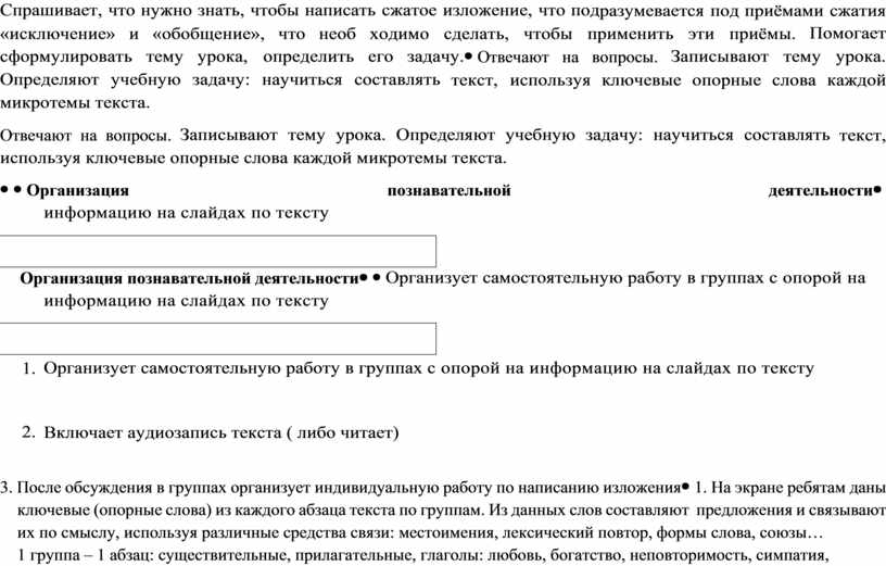 3. После обсуждения в группах организует индивидуальную работу по написанию изложения |