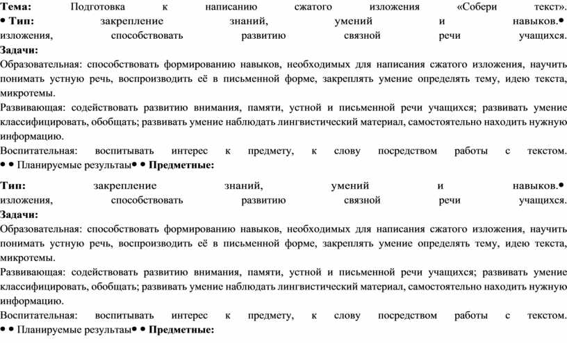 сжатого изложения, способствовать развитию связной речи учащихся. |
