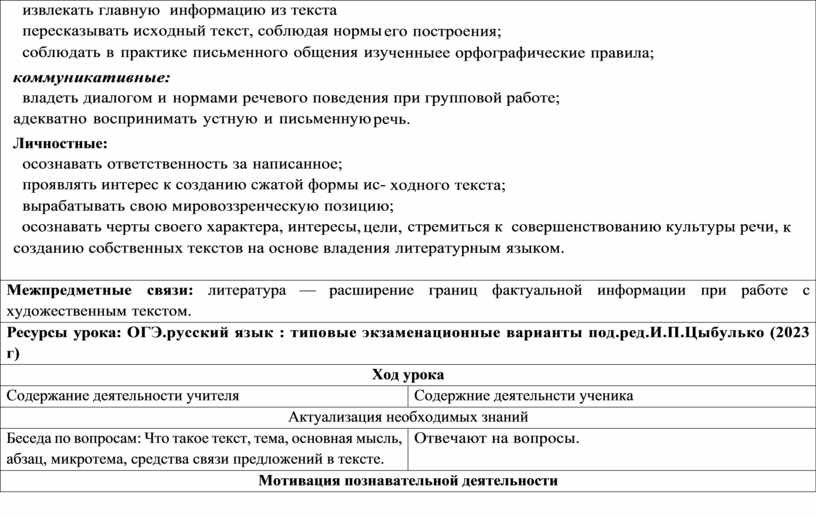 Предметные: Использовать приемы сжатия текста. Выделять главную мысль теста в целом и микротемы Метапредметные: регулятивные: воспроизводить прочитанный художественный текст в сжатом виде сохранять логичность, связность, соответствие теме при воспроизведении текста в свёрнутой форме. соблюдать при воспроизведении текста основные нормы русского литературного языка и правила правописания; познавательные: извлекать главную информацию из текста пересказывать исходный текст, соблюдая нормы его построения; соблюдать в практике письменного общения изученныее орфографические правила; коммуникативные: владеть диалогом и нормами речевого поведения при групповой работе; адекватно воспринимать устную и письменную речь. Личностные: осознавать ответственность за написанное; проявлять интерес к созданию сжатой формы ис- ходного текста; вырабатывать свою мировоззренческую позицию; осознавать черты своего характера, интересы, цели, стремиться к совершенствованию культуры речи, к созданию собственных текстов на основе владения литературным языком.