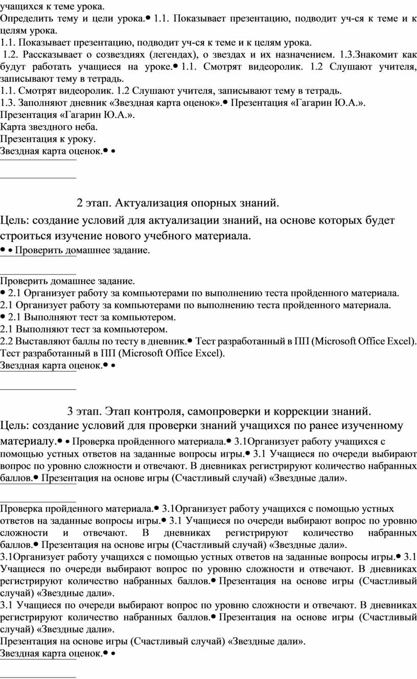 Используемые технологические подходы и приемы обучения: игра счастливый случай в ЭТ, тестовые задания разработанные в ПП Microsoft Office Excel, дидактические карты созвездий, презентация по рефлексии «Путешествие по вселенной», график успеваемости.