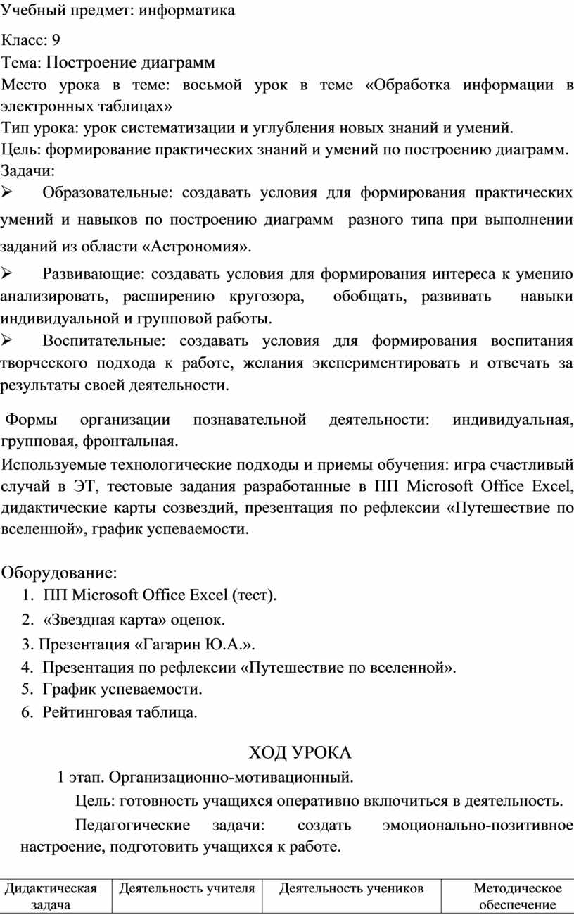 Ø Образовательные: создавать условия для формирования практических умений и навыков по построению диаграмм разного типа при выполнении заданий из области «Астрономия».