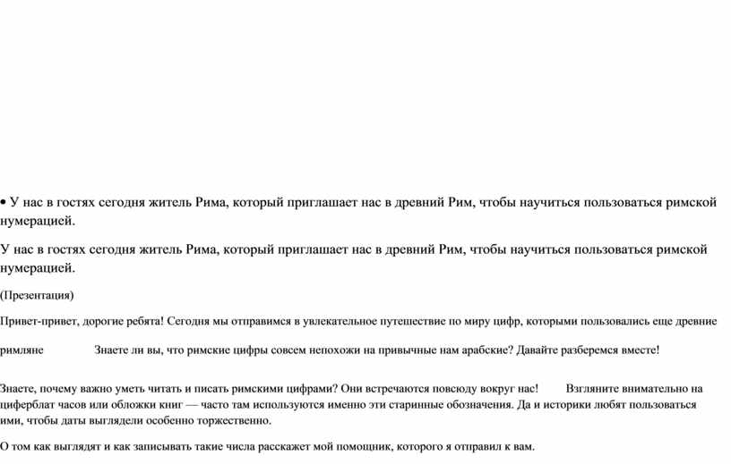 У нас в гостях сегодня житель Рима, который приглашает нас в древний Рим, чтобы научиться пользоваться римской нумерацией. (Презентация) Привет-привет, дорогие ребята! Сегодня мы отправимся в