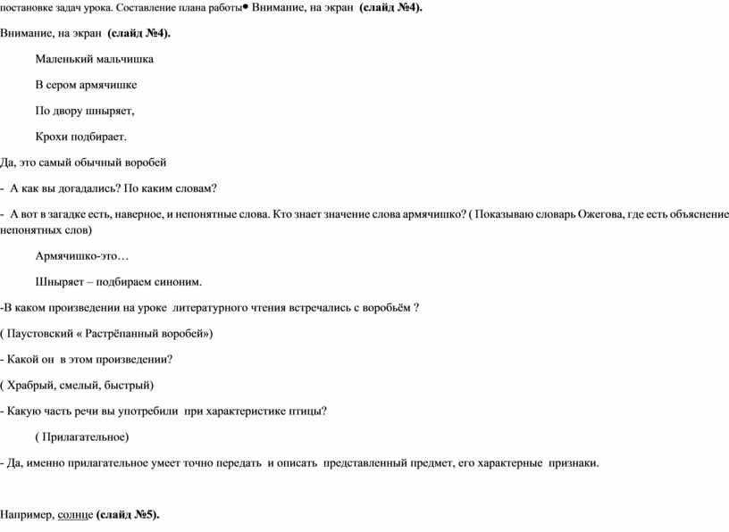 Внимание, на экран (слайд №4). Маленький мальчишка В сером армячишке По двору шныряет, Крохи подбирает. Да, это самый обычный воробей - А как вы догадались? По каким словам? - А вот в загадке есть, наверное, и непонятные слова. Кто знает значение слова армячишко? ( Показываю словарь Ожегова, где есть объяснение непонятных слов) Армячишко-это… Шныряет – подбираем синоним. -В каком произведении на уроке литературного чтения встречались с воробьём ? ( Паустовский « Растрёпанный воробей») - Какой он в этом произведении? ( Храбрый, смелый, быстрый) - Какую часть речи вы употребили при характеристике птицы? ( Прилагательное) - Да, именно прилагательное умеет точно передать и описать представленный предмет, его характерные признаки.