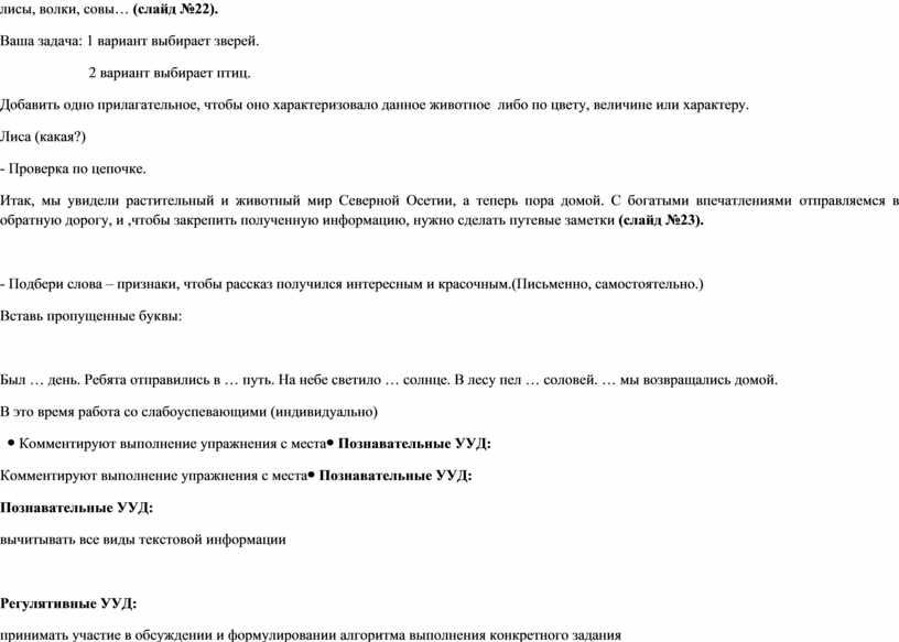 Теперь воробей нам покажет животный мир республики (слайд №21). Какие животные обитают в Северной Осетии: лисы, волки, совы… (слайд №22). Ваша задача: 1 вариант выбирает зверей. 2 вариант выбирает птиц. Добавить одно прилагательное, чтобы оно характеризовало данное животное либо по цвету, величине или характеру. Лиса (какая?) - Проверка по цепочке. Итак, мы увидели растительный и животный мир Северной Осетии, а теперь пора домой. С богатыми впечатлениями отправляемся в обратную дорогу, и ,чтобы закрепить полученную информацию, нужно сделать путевые заметки (слайд №23).