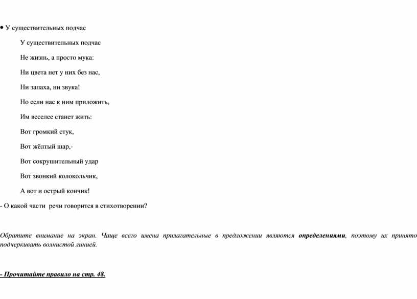 Обратите внимание на экран. Чаще всего имена прилагательные в предложении являются определениями, поэтому их принято подчеркивать волнистой линией.