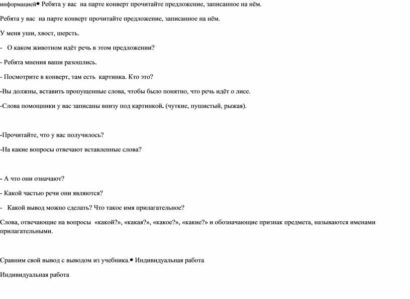 Ребята у вас на парте конверт прочитайте предложение, записанное на нём. У меня уши, хвост, шерсть. - О каком животном идёт речь в этом предложении? - Ребята мнения ваши разошлись. - Посмотрите в конверт, там есть картинка. Кто это? -Вы должны, вставить пропущенные слова, чтобы было понятно, что речь идёт о лисе. -Слова помощники у вас записаны внизу под картинкой. (чуткие, пушистый, рыжая).