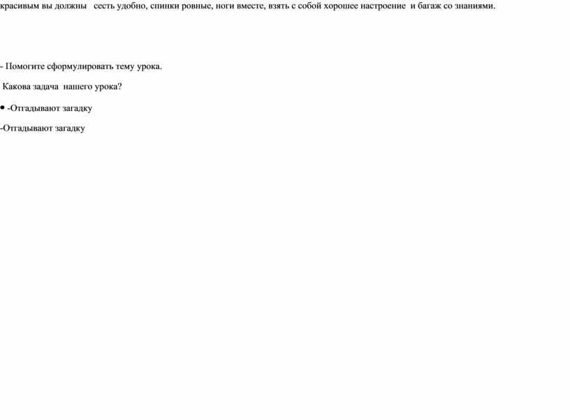- Воробей нас заждался и зовёт в путь. И чтобы путешествие было приятным и красивым вы должны сесть удобно, спинки ровные, ноги вместе, взять с собой хорошее настроение и багаж со знаниями.