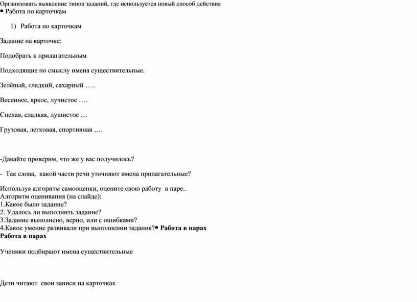 -Давайте проверим, что же у вас получилось? - Так слова, какой части речи уточняют имена прилагательные? Используя алгоритм самооценки, оцените свою работу в паре.. Алгоритм оценивания (на слайде): 1.Какое было задание? 2. Удалось ли выполнить задание? 3.Задание выполнено, верно, или с ошибками? 4.Какое умение развивали при выполнении задания? |