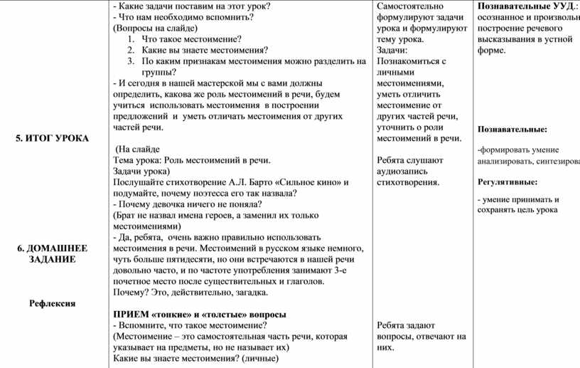 • знакомство обучающихся с ролью местоимений в речи, их особенностями;