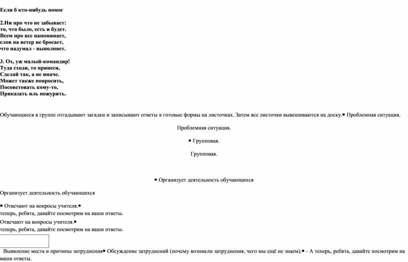 Обсуждение затруднений (почему возникли затруднения, чего мы ещё не знаем). |