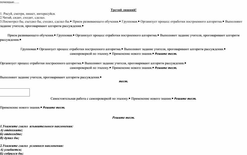 Незаконченное предложение. 1. 1.Глагол-это часть речи, которая…. 2. 2.Глаголы изъявительного наклонения обозначают действия, которые……… 3. 3.Глаголы повелительного наклонения обозначают действия, которые………. 4. 4.Глаголы сослагательного наклонения обозначают действия, которые………. 5. 5.Ь после шипящих в глаголах повелительного наклонения……….. 6. 6.Глаголы повелительного наклонения множественного числа образуются с помощью….. 7. Третий лишний! 1. 1. Рисуй, смотри, пишет, интересуйся. 2. 2.Читай, сидит, сходит, сделал. 3. 3.Посмотрел бы, съездил бы, сходил, сделал бы. |