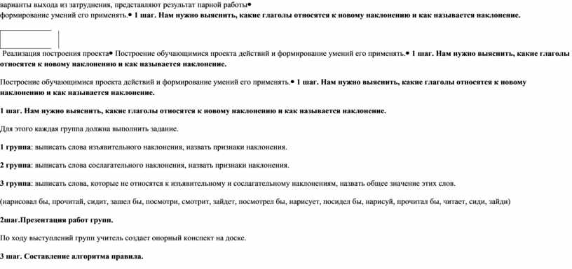 1 шаг. Нам нужно выяснить, какие глаголы относятся к новому наклонению и как называется наклонение. Для этого каждая группа должна выполнить задание. 1 группа: выписать слова изъявительного наклонения, назвать признаки наклонения. 2 группа: выписать слова сослагательного наклонения, назвать признаки наклонения. 3 группа: выписать слова, которые не относятся к изъявительному и сослагательному наклонениям, назвать общее значение этих слов. (нарисовал бы, прочитай, сидит, зашел бы, посмотри, смотрит, зайдет, посмотрел бы, нарисует, посидел бы, нарисуй, прочитал бы, читает, сиди, зайди) 2шаг.Презентация работ групп. По ходу выступлений групп учитель создает опорный конспект на доске. 3 шаг. Составление алгоритма правила.