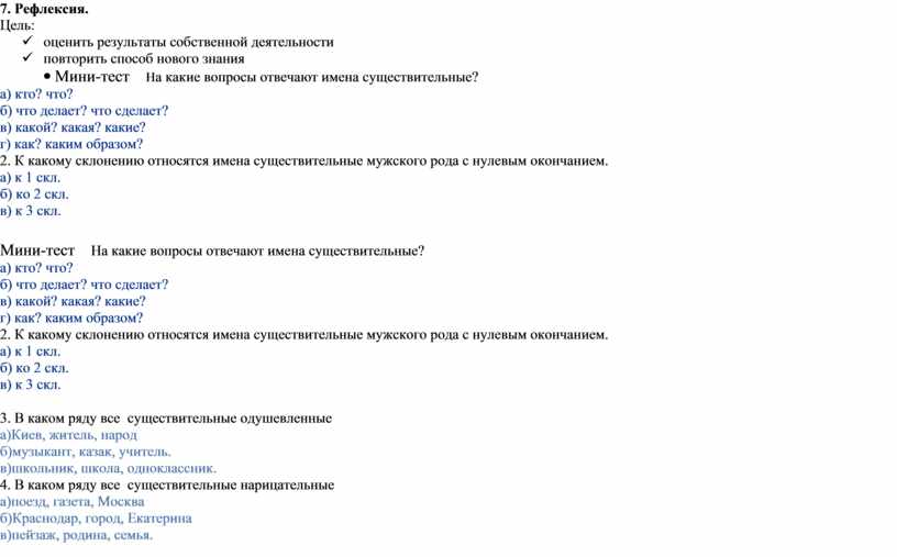 Мини-тест На какие вопросы отвечают имена существительные? 3. В каком ряду все существительные одушевленные а)Киев, житель, народ б)музыкант, казак, учитель. в)школьник, школа, одноклассник. 4. В каком ряду все существительные нарицательные а)поезд, газета, Москва б)Краснодар, город, Екатерина в)пейзаж, родина, семья.