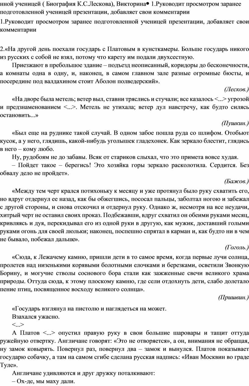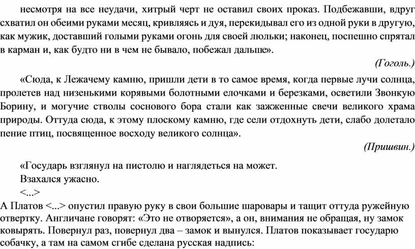 2.«На другой день поехали государь с Платовым в кунсткамеры. Больше государь никого из русских с собой не взял, потому что карету им подали двухсестную. Приезжают в пребольшое здание – подъезд неописанный, коридоры до бесконечности, а комнаты одна в одну, и, наконец, в самом главном зале разные огромные бюсты, и посередине под валдахином стоит Аболон полведерский». (Лесков.) «На дворе была метель; ветер выл, ставни тряслись и стучали; все казалось <...> угрозой и предзнаменованием <...>. Метель не утихала; ветер дул навстречу, как будто силясь остановить...» (Пушкин.) «Был еще на руднике такой случай. В одном забое пошла руда со шлифом. Отобьют кусок, а у него, глядишь, какой-нибудь уголышек гладехонек. Как зеркало блестит, глядись в него – кому любо. Ну, рудобоям не до забавы. Всяк от стариков слыхал, что это примета вовсе худая. – Пойдет такое – берегись! Это хозяйка горы зеркало расколотила. Сердится. Без обвалу дело не пройдет». (Бажов.) «Между тем черт крался потихоньку к месяцу и уже протянул было руку схватить его, но вдруг отдернул ее назад, как бы обжегшись, пососал пальцы, заболтал ногою и забежал с другой стороны, и снова отскочил и отдернул руку. Однако ж, несмотря на все неудачи, хитрый черт не оставил своих проказ. Подбежавши, вдруг схватил он обеими руками месяц, кривляясь и дуя, перекидывал его из одной руки в другую, как мужик, доставший голыми руками огонь для своей люльки; наконец, поспешно спрятал в карман и, как будто ни в чем не бывало, побежал дальше». (Гоголь.) «Сюда, к Лежачему камню, пришли дети в то самое время, когда первые лучи солнца, пролетев над низенькими корявыми болотными елочками и березками, осветили Звонкую Борину, и могучие стволы соснового бора стали как зажженные свечи великого храма природы. Оттуда сюда, к этому плоскому камню, где сели отдохнуть дети, слабо долетало пение птиц, посвященное восходу великого солнца». (Пришвин.) «Государь взглянул на пистолю и наглядеться на может. Взахался ужасно. <...> А Платов <...> опустил правую руку в свои большие шаровары и тащит оттуда ружейную отвертку. Англичане говорят: «Это не отворяется», а он, внимания не обращая, ну замок ковырять. повернул раз, повернул два – замок и вынулся. Платов показывает государю собачку, а там на самом сгибе сделана русская надпись: «Иван Москвин во граде Туле». Англичане удивляются и друг дружку поталкивают: – Ох-де, мы маху дали. А государь Платову грустно говорит: – Зачем ты их очень сконфузил, мне их теперь очень жалко». (Лесков «Левша».) (Лесков «Левша») – Какова главная мысль этого лесковского рассказа? (Богата талантами русская земля. Такого мастерства есть люди, что даже блоху подковать им по плечу. Несладко им живется, но для них главным всегда была любимая дорога и родина. А охотников видеть «удивления» только в заморских странах всегда было немало.)