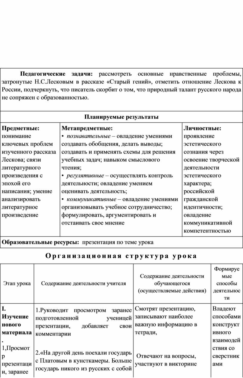 Педагогические задачи: рассмотреть основные нравственные проблемы, затронутые Н.С.Лесковым в рассказе «Старый гений», отметить отношение Лескова к России, подчеркнуть, что писатель скорбит о том, что природный талант русского народа не сопряжен с образованностью.