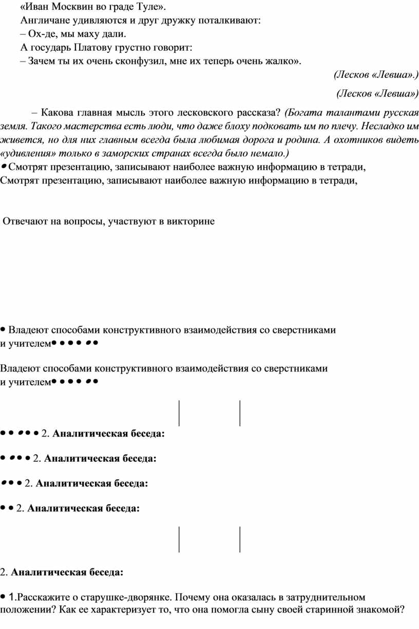 Предметные: понимание ключевых проблем изученного рассказа Лескова; связи литературного произведения с эпохой его написания; умение анализировать литературное произведение |