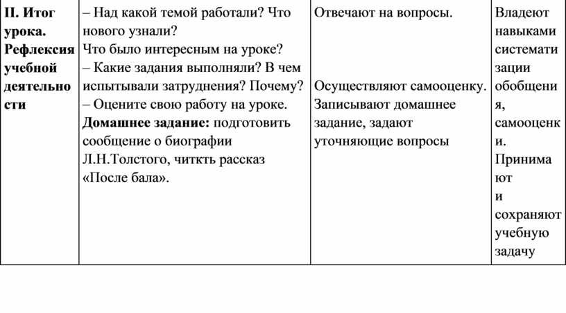 – Над какой темой работали? Что нового узнали? – Какие задания выполняли? В чем испытывали затруднения? Почему? – Оцените свою работу на уроке. Домашнее задание: подготовить сообщение о биографии Л.Н.Толстого, читкть рассказ «После бала». |