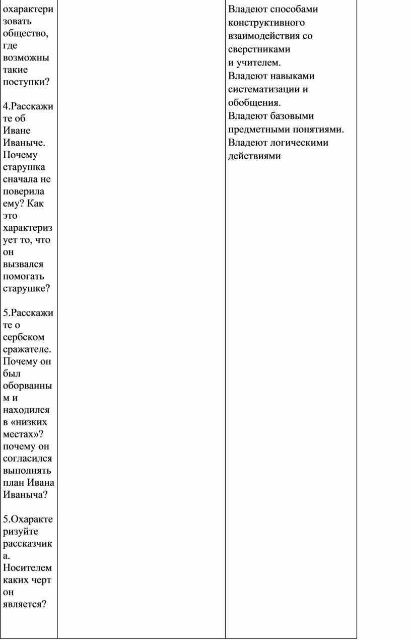 1.Расскажите о старушке-дворянке. Почему она оказалась в затруднительном положении? Как ее характеризует то, что она помогла сыну своей старинной знакомой? 2.Расскажите о порядках в чиновничьей России. Почему чиновники не помогли старушке? О чем свидетельствует тот факт, что они боялись связываться с великосветским франтом? 3.Расскажите о великосветском франте. Почему его поступки и поведение оказались безнаказанными? Как можно охарактеризовать общество, где возможны такие поступки? 4.Расскажите об Иване Иваныче. Почему старушка сначала не поверила ему? Как это характеризует то, что он вызвался помогать старушке? 5.Расскажите о сербском сражателе. Почему он был оборванным и находился в «низких местах»? почему он согласился выполнять план Ивана Иваныча? 5.Охарактеризуйте рассказчика. Носителем каких черт он является?