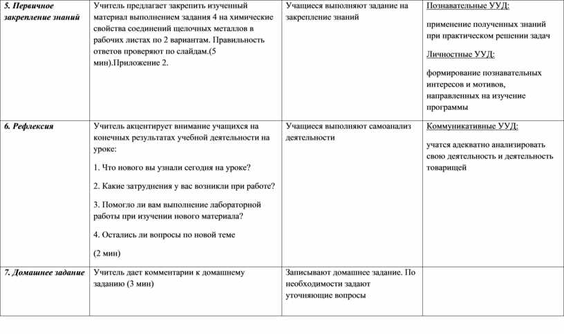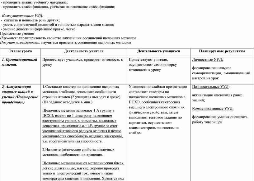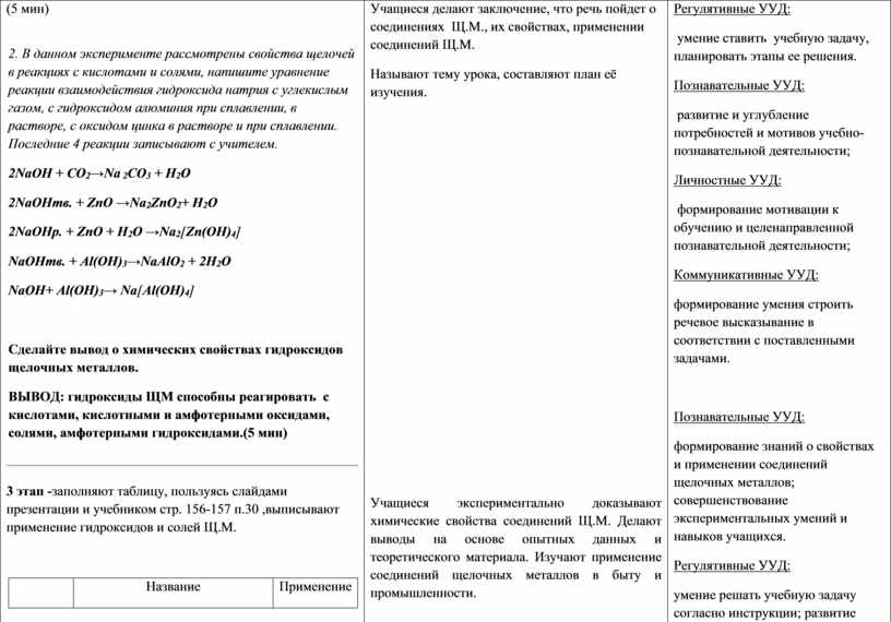 Познавательные УУД: формирование знаний о свойствах и применении соединений щелочных металлов; совершенствование экспериментальных умений и навыков учащихся. Регулятивные УУД: умение решать учебную задачу согласно инструкции; развитие умений выбирать и анализировать информацию, полученную в результате эксперимента, работы с учебником Коммуникативные УУД: формировать умение планировать работу в группе, логически излагать свои выводы. Личностные УУД: развивать познавательный интерес школьников, используя данные о применении изучаемых явлений в окружающей жизни.