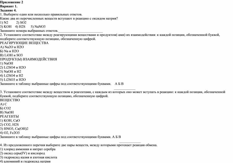 Учитель предлагает закрепить изученный материал выполнением задания 4 на химические свойства соединений щелочных металлов в рабочих листах по 2 вариантам. Правильность ответов проверяют по слайдам.(5 мин).Приложение 2.