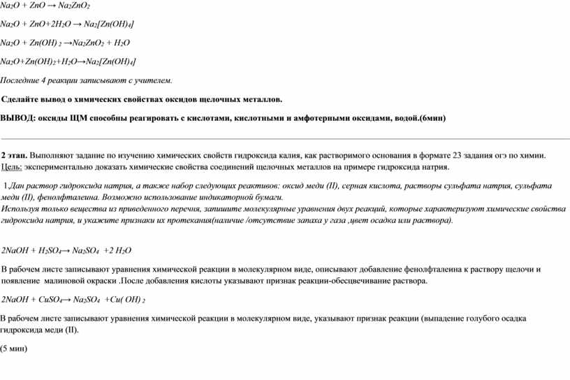 фенолфталеина. Возможно использование индикаторной бумаги. 1. 2. В рабочем листе записывают уравнения химической реакции в молекулярном виде, описывают добавление фенолфталеина к раствору щелочи и появление малиновой окраски .После добавления кислоты указывают признак реакции-обесцвечивание раствора. 3. 2NaOH + CuSO4→ Na2SO4 +Cu( OH) 2 В рабочем листе записывают уравнения химической реакции в молекулярном виде, указывают признак реакции (выпадение голубого осадка гидроксида меди (II). (5 мин) 1. 2. В данном эксперименте рассмотрены свойства щелочей в реакциях с кислотами и солями, напишите уравнение реакции взаимодействия гидроксида натрия с углекислым газом, с гидроксидом алюминия при сплавлении, в растворе, с оксидом цинка в растворе и при сплавлении. Последние 4 реакции записывают с учителем. 2NaОН + CO2→Na 2CO3 + H2O 2NaОНтв. + ZnO →Na2ZnO2+ H2O 2NaОНр. + ZnO + H2O →Na2[Zn(OH)4] NaОНтв. + Al(OH)3→NaAlO2 + 2H2O NaOH+ Al(OH)3→ Na[Al(OH)4]
