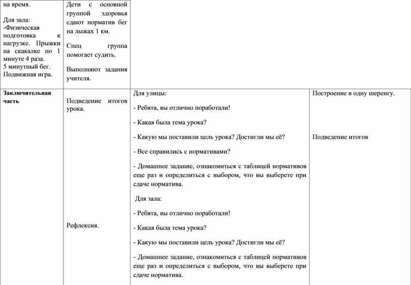 Для улицы: - Ребята, вы отлично поработали! - Какая была тема урока? - Какую мы поставили цель урока? Достигли мы её? - Все справились с нормативами? - Домашнее задание, ознакомиться с таблицей нормативов еще раз и определиться с выбором, что вы выберете при сдаче норматива. Для зала: - Ребята, вы отлично поработали! - Какая была тема урока? - Какую мы поставили цель урока? Достигли мы её? - Домашнее задание, ознакомиться с таблицей нормативов еще раз и определиться с выбором, что вы выберете при сдаче норматива. Выставление оценок.