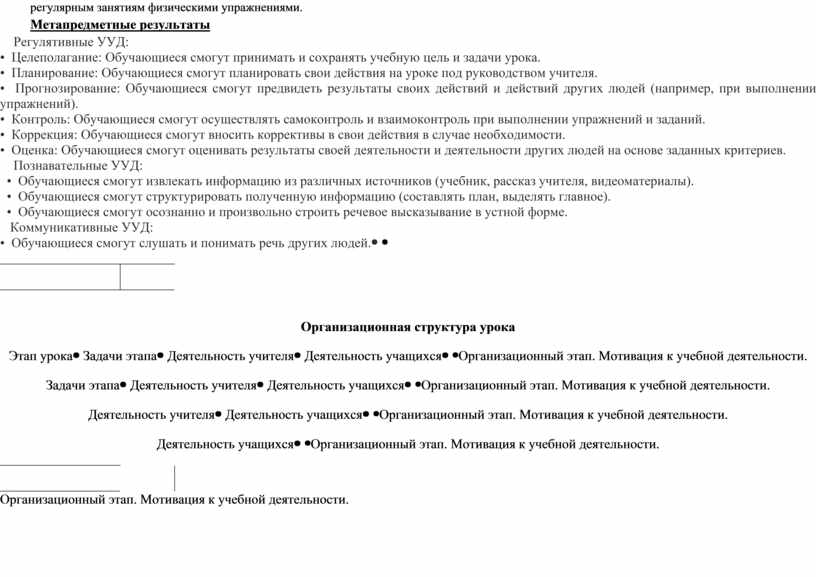 Личностные результаты: К концу урока у обучающихся будет сформировано: • Осознанное понимание важности соблюдения правил техники безопасности для сохранения здоровья и предотвращения травм. • Положительное отношение к занятиям физической культурой и спортом. • Интерес к истории и традициям российского спорта. • Чувство ответственности за свою безопасность и безопасность окружающих. • Мотивация к ведению здорового образа жизни и регулярным занятиям физическими упражнениями. Метапредметные результаты Регулятивные УУД: • Целеполагание: Обучающиеся смогут принимать и сохранять учебную цель и задачи урока. • Планирование: Обучающиеся смогут планировать свои действия на уроке под руководством учителя. • Прогнозирование: Обучающиеся смогут предвидеть результаты своих действий и действий других людей (например, при выполнении упражнений). • Контроль: Обучающиеся смогут осуществлять самоконтроль и взаимоконтроль при выполнении упражнений и заданий. • Коррекция: Обучающиеся смогут вносить коррективы в свои действия в случае необходимости. • Оценка: Обучающиеся смогут оценивать результаты своей деятельности и деятельности других людей на основе заданных критериев. Познавательные УУД: • Обучающиеся смогут извлекать информацию из различных источников (учебник, рассказ учителя, видеоматериалы). • Обучающиеся смогут структурировать полученную информацию (составлять план, выделять главное). • Обучающиеся смогут осознанно и произвольно строить речевое высказывание в устной форме. Коммуникативные УУД: • Обучающиеся смогут слушать и понимать речь других людей. |