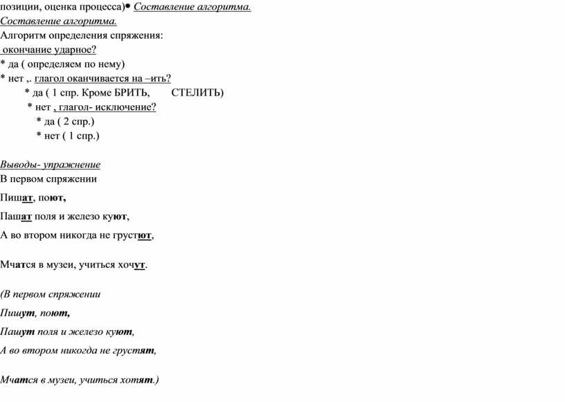 Составление алгоритма. Алгоритм определения спряжения: окончание ударное? * да ( определяем по нему) * нет ,. глагол оканчивается на –ить? * да ( 1 спр. Кроме БРИТЬ, СТЕЛИТЬ) * нет , глагол- исключение? * да ( 2 спр.) * нет ( 1 спр.)
