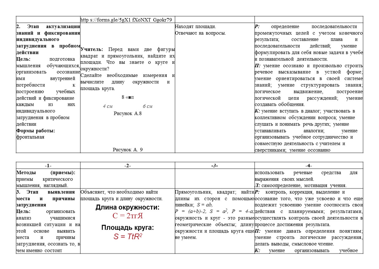 3. Этап выявления анализ учащимися возникшей ситуации и на этой основе выявить места и причины затруднения, осознать то, в чем именно состоит | Объясняет, что необходимо найти площадь круга и длину окружности. | Прямоугольник, квадрат; найти длины их сторон с помощью линейки; S = ab, | Р: контроль, коррекция, выделение и |