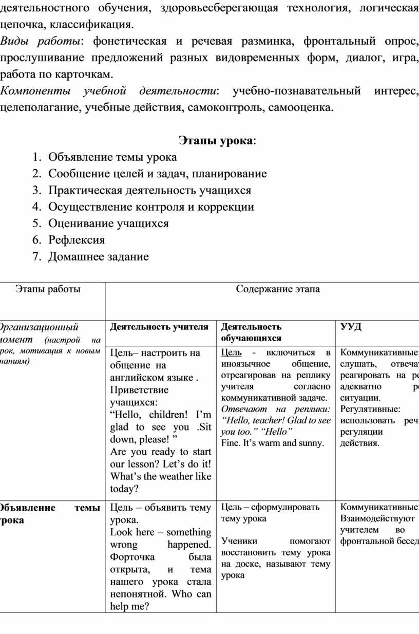 Цель– настроить на общение на английском языке . Приветствие учащихся: “Hello, children! I’m glad to see you .Sit down, please! ” Are you ready to start our lesson? Let’s do it! What’s the weather like today? |