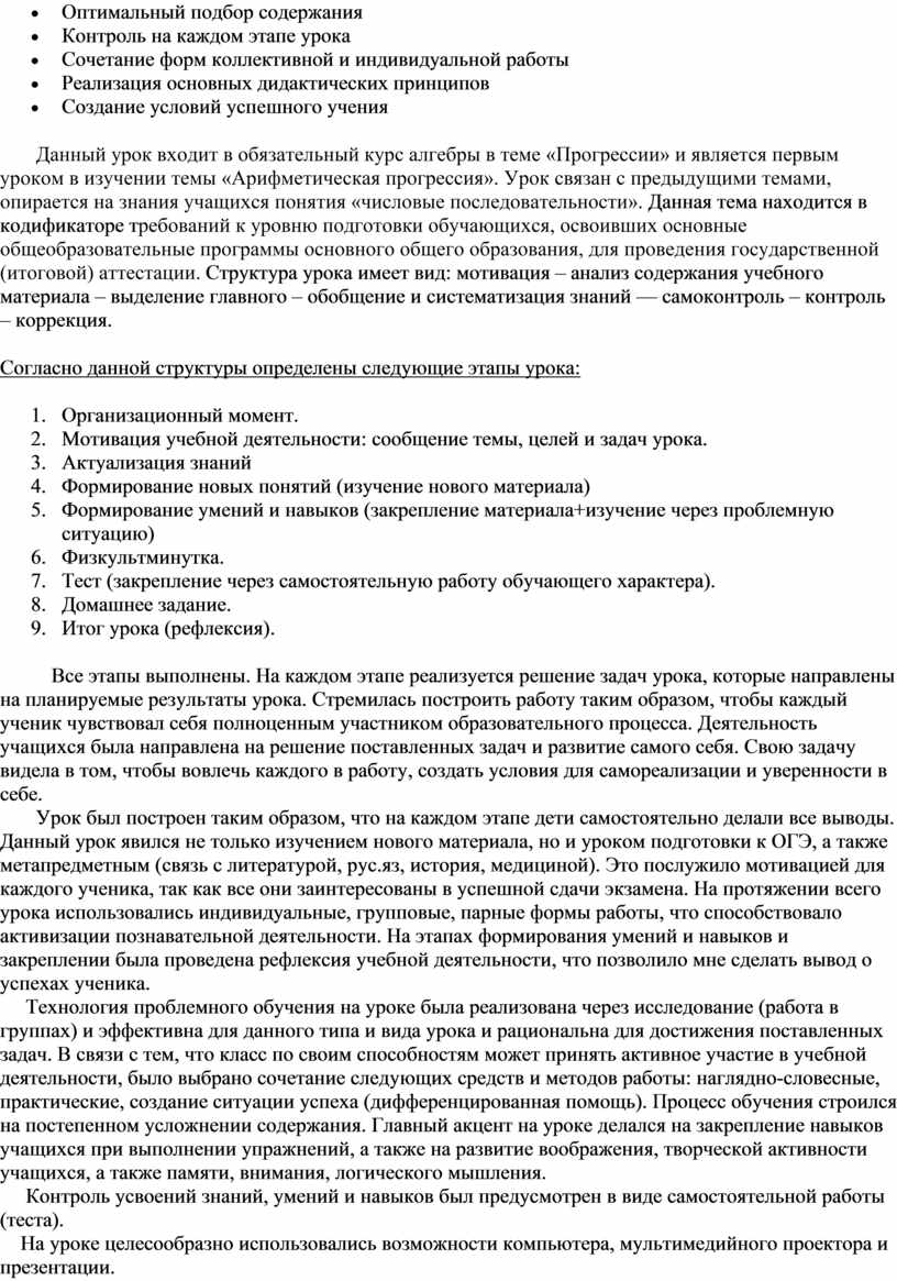 Данный урок входит в обязательный курс алгебры в теме «Прогрессии» и является первым уроком в изучении темы «Арифметическая прогрессия». Урок связан с предыдущими темами, опирается на знания учащихся понятия «числовые последовательности». Данная тема находится в кодификаторе требований к уровню подготовки обучающихся, освоивших основные общеобразовательные программы основного общего образования, для проведения государственной (итоговой) аттестации. Структура урока имеет вид: мотивация – анализ содержания учебного материала – выделение главного – обобщение и систематизация знаний –– самоконтроль – контроль – коррекция.