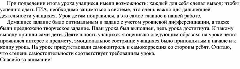 Домашнее задание было оптимальным и задано с учетом уровневой дифференциации, а также были предложено творческое задание. План урока был выполнен, цель урока достигнута. К такому выводу пришли сами дети. Деятельность учащихся я оцениваю следующим образом: на уроке чётко проявился интерес к предмету, эмоциональное состояние учащихся было приподнятым в начале и к концу урока. На уроке присутствовали самоконтроль и самокоррекция со стороны ребят. Считаю, что степень самостоятельности соответствует требованиям урока.