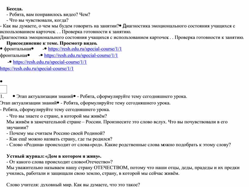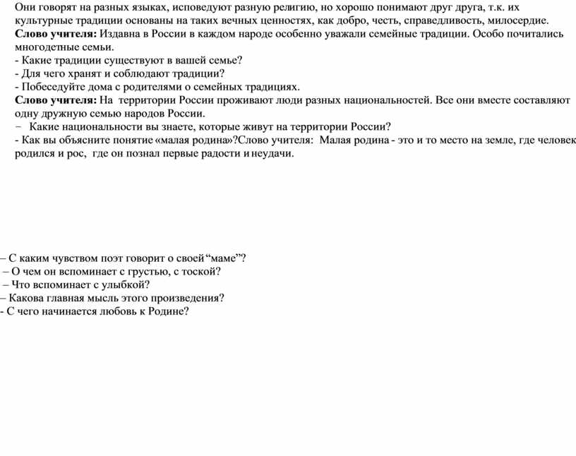 Слово учителя: В духовном мире есть свои дороги. Они называются традициями. Культурные традиции – это богатство нашей многонациональной страны. В нашей стране живут люди, которые знают и бережно хранят разные традиции. Они говорят на разных языках, исповедуют разную религию, но хорошо понимают друг друга, т.к. их культурные традиции основаны на таких вечных ценностях, как добро, честь, справедливость, милосердие. Слово учителя: Издавна в России в каждом народе особенно уважали семейные традиции. Особо почитались многодетные семьи. - Какие традиции существуют в вашей семье? - Для чего хранят и соблюдают традиции? - Побеседуйте дома с родителями о семейных традициях. Слово учителя: На территории России проживают люди разных национальностей. Все они вместе составляют одну дружную семью народов России. – Какие национальности вы знаете, которые живут на территории России? - Как вы объясните понятие «малая родина»?Слово учителя: Малая родина - это и то место на земле, где человек родился и рос, где он познал первые радости и неудачи.