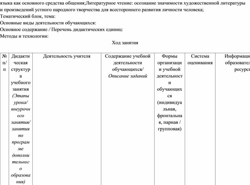 Дидактическая структура учебного занятия (Этапы урока/ внеурочного занятия/ занятия по программе дополнительного образования) |
