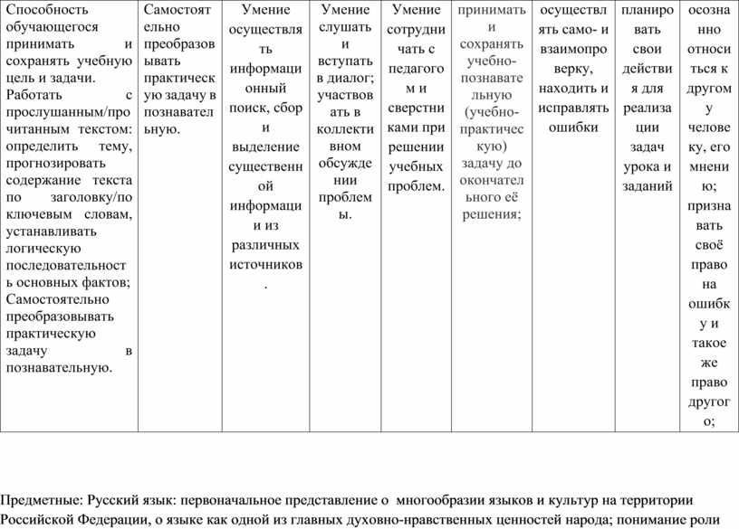 Предметные: Русский язык: первоначальное представление о многообразии языков и культур на территории Российской Федерации, о языке как одной из главных духовно-нравственных ценностей народа; понимание роли языка как основного средства общения;Литературное чтение: осознание значимости художественной литературы и произведений устного народного творчества для всестороннего развития личности человека;