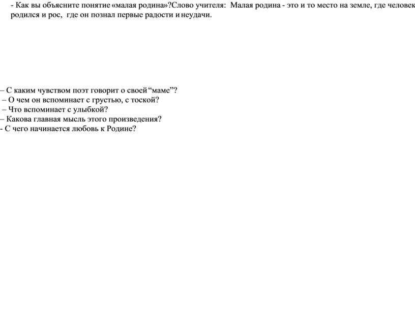 – С каким чувством поэт говорит о своей “маме”? – О чем он вспоминает с грустью, с тоской? – Что вспоминает с улыбкой? – Какова главная мысль этого произведения? - С чего начинается любовь к Родине?