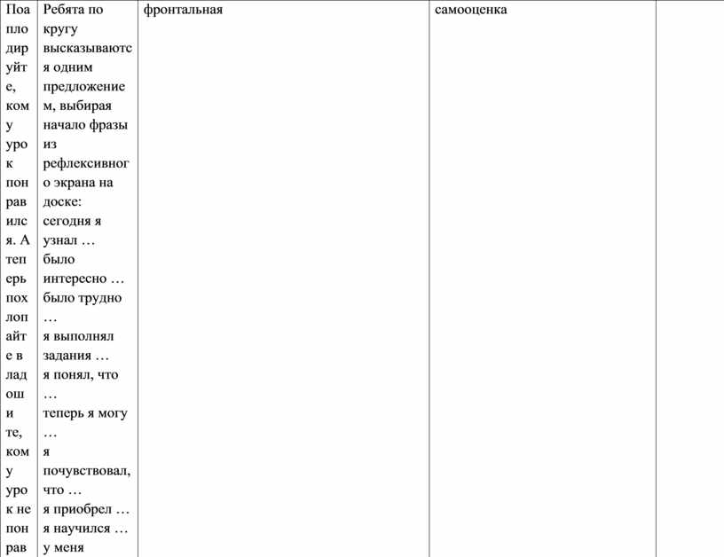 Ребята по кругу высказываются одним предложением, выбирая начало фразы из рефлексивного экрана на доске: сегодня я узнал …
